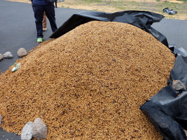 その後、ドン・エステバンドライミル(乾燥場)に運ばれ、10日~12日程度の乾燥工程に移ります。まずは、水分値が20%になるまで天日での初期乾燥がされます。この時、グリーンビーンズとパーチメントの隙間が開いてしまうとバクテリアが侵入する為、気温や日差しが強くなるときは黒いビニールをかぶせ日陰を作りながら丁寧に20%までもっていきます。
